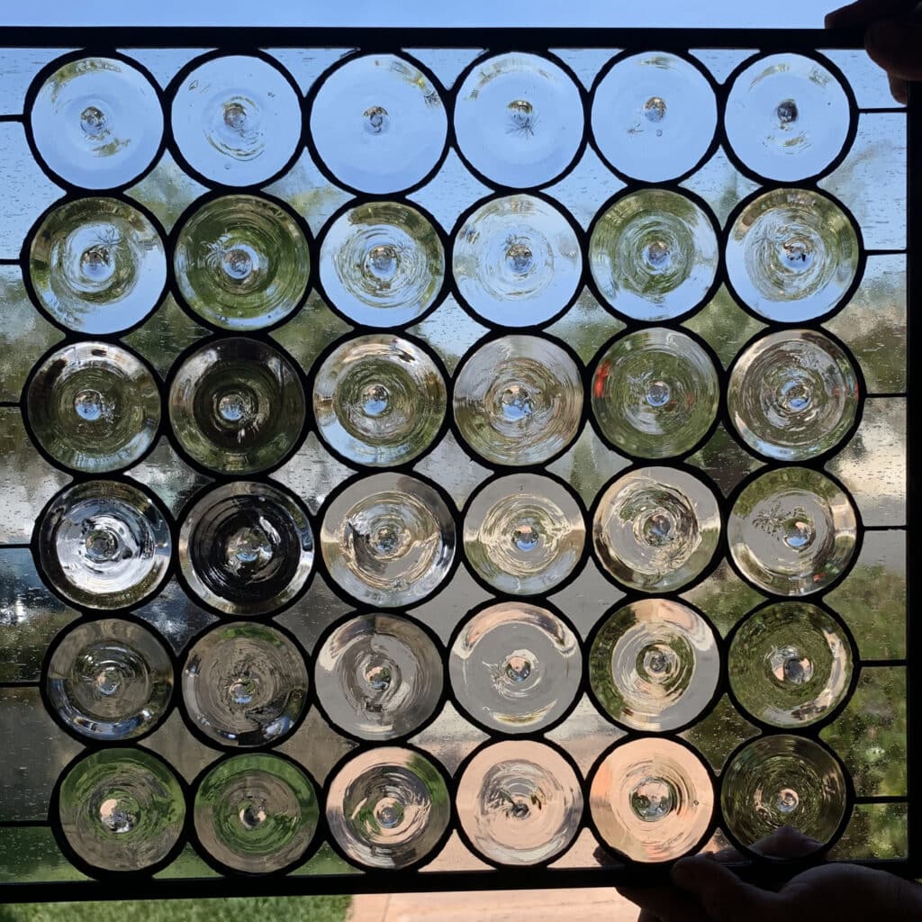 While technically known as rondels, these discs are frequently sought after by designers as “clear glass bottle bottoms” or “bullseye glass bottoms” to add a vintage, architectural feel to transoms and cabinets.